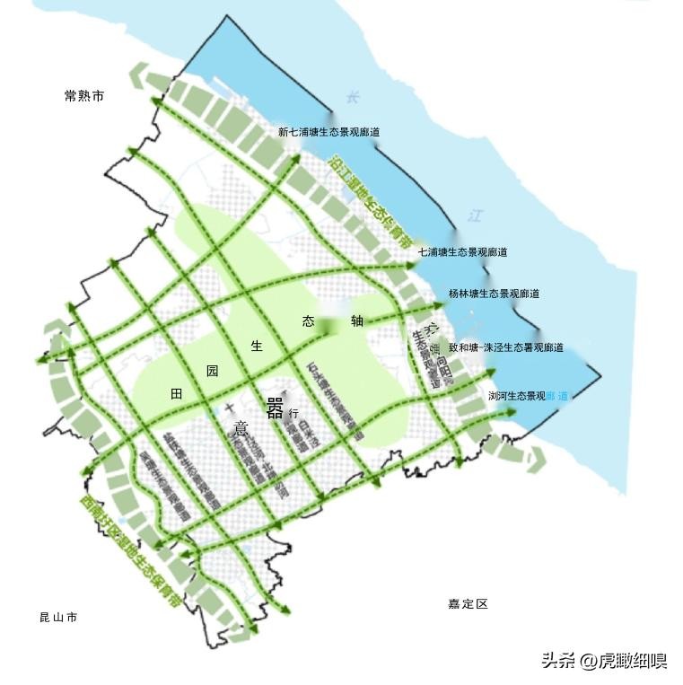 六廊:新浏河、 杨林塘、 七浦塘、 盐铁塘、滨江大道、 太沙公路景观风貌廊道。