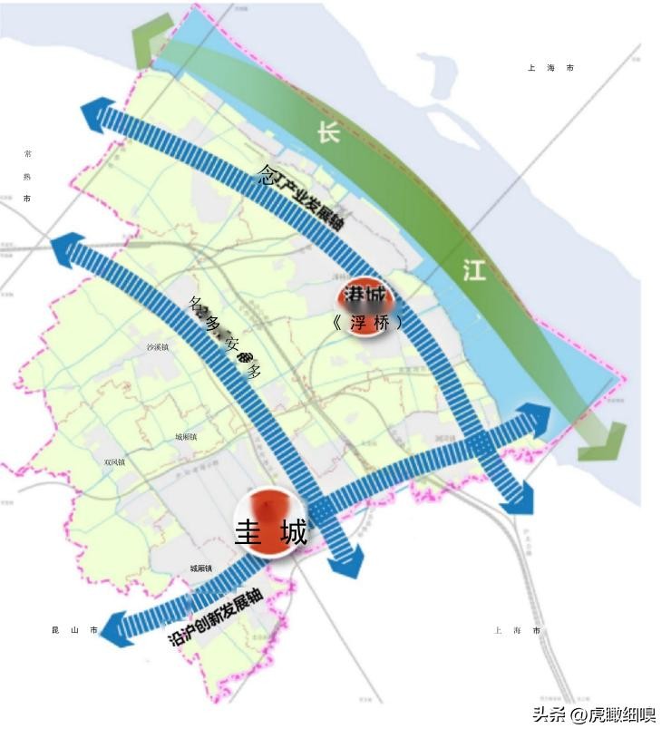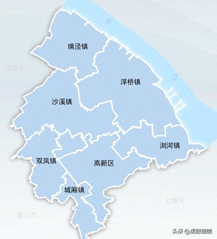 镇:沙溪镇: 中国历史文化名镇, 新型产业基地。浏河镇: 苏州历史文化名镇, 临沪滨江的生态休闲和旅游度假为主的城镇。璜泾镇: 沿江片区以现代农业发展为主的城镇。双凤镇: 以生态产业和城乡服务为主的城镇。