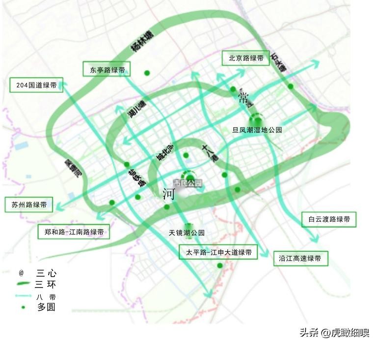 五横六纵:依托主要骨干河道形成的十一条生态景观廊道。