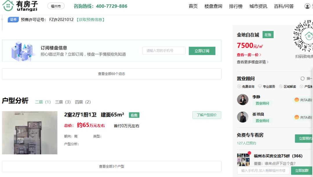记者看到某套房子网上挂出的一则广告:“福州金地自在城 2室2厅1厨1卫 总价65万元左右 首付0元。”1月14日,记者按照网站提示拨打了咨询电话。针对零首付问题,售楼中心彭先生向记者表示,之前65平方米的房源因为总价低,可以零首付,但实际也要首付1至2万元。现在主要销售户型为82平方米的房源,每平方米七八千元,总价约50万至60万元,正常首付要支付房款的15%,约9万元。如果客户需要的话,实际首付可以做到只要两三万元。实际上总价都一样,低首付只是多贷款。