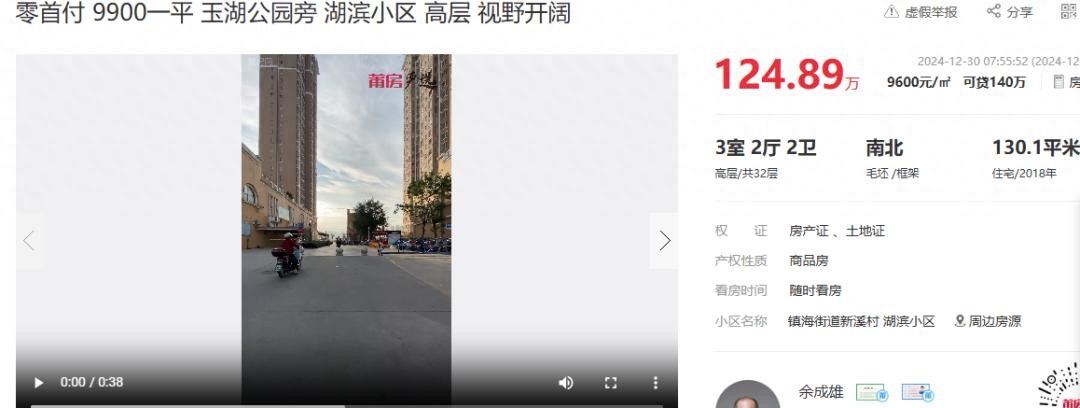 “零首付 9900/平 玉湖公园旁”,1月14日,莆房网“余成雄的店铺”上一则广告引起了记者的注意。记者当即联系广告标示的房产经纪人余先生。余先生自称是莆田市中意房产公司工作人员,他告诉记者,这套二手房位于湖滨小区,面积130平方米,两证齐全,实价只要9600元/平方米,可免首付,只要按期还贷即可。