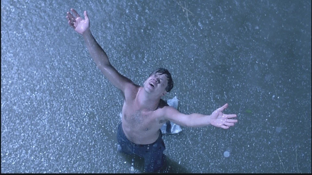 《肖申克的救赎》中经典的“迎接自由”剧照。
