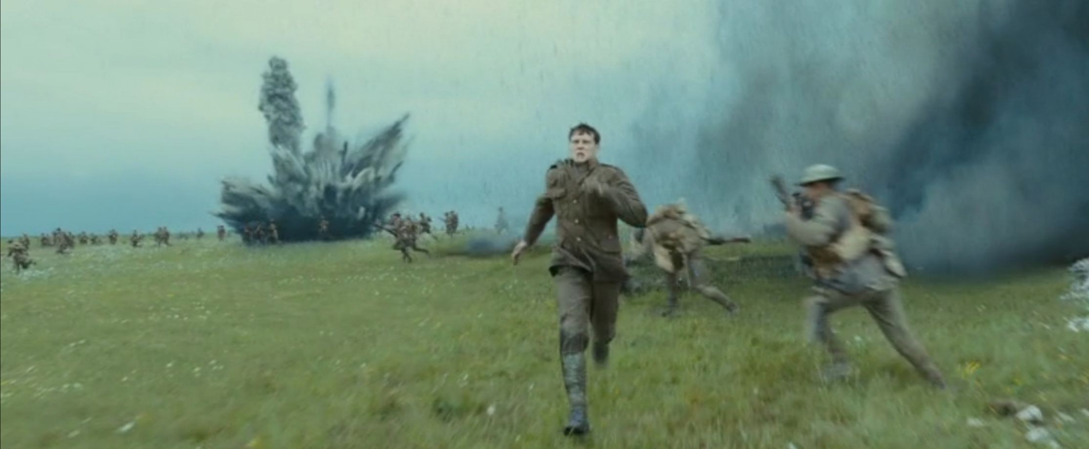 《1917》结尾时斯科菲尔德在前线奔跑的镜头。
