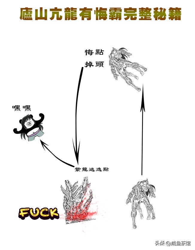 完整版的亢龙有悔霸,其实是架着对手垂直飞行一段距离,在对手没来得及聚集强势小宇宙破解的临界点,停止升空并进入下坠模式(悔点),这时候对手会认为临时变招丧失应对能力,再加上高速上升跟下坠产生的血压差,使其小宇宙进入涣散模式,无法暴力挣脱束缚。
