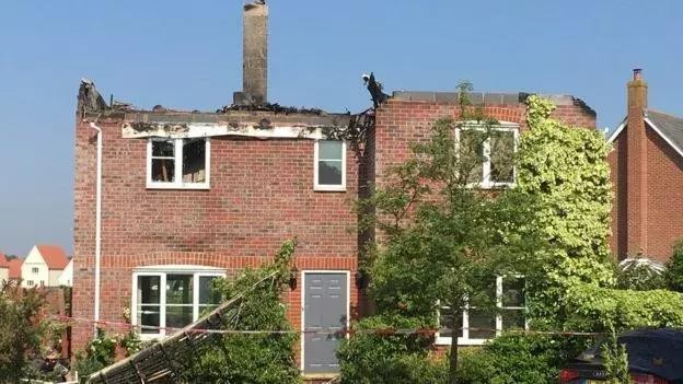 英国埃塞克斯郡一处因雷击烧毁屋顶的民居。