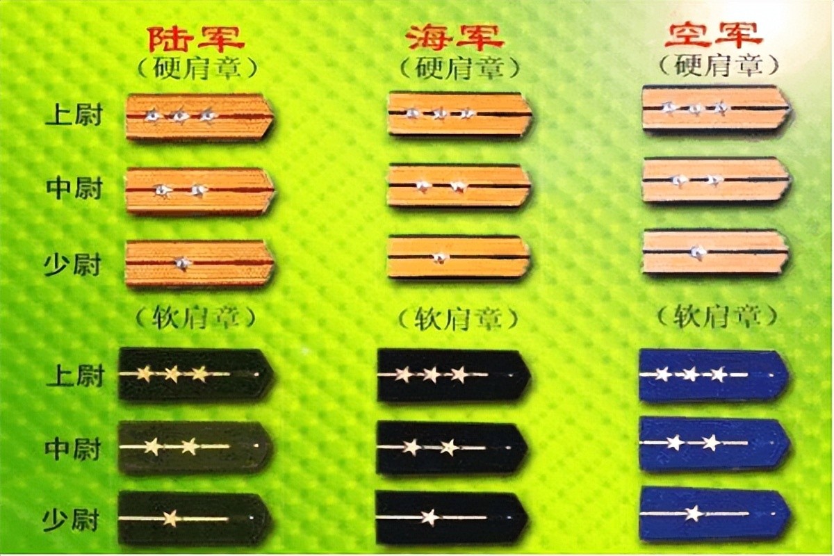 士兵军衔肩章版面底色:陆军为棕绿色,海军为黑色,空军为天蓝色