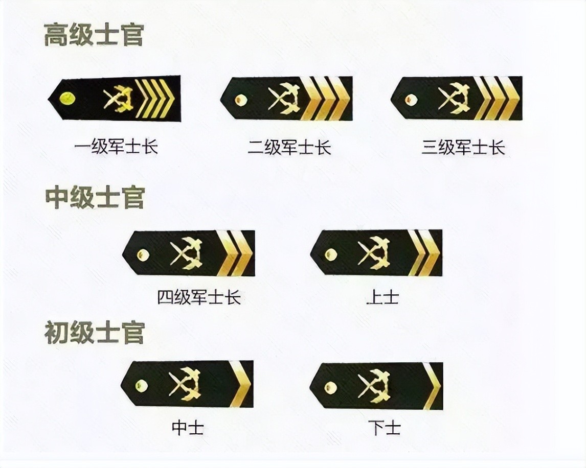 士官军衔分为六级:一级士官、二级士官、三级士官、四级士官、五级士官、六级士官,七级士官