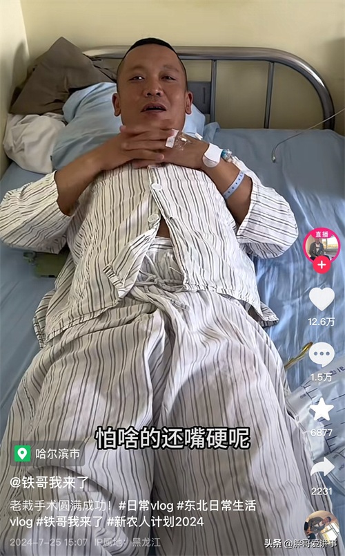 翻看铁哥来了的视频可以看到,在7月25日的那期视频中:老栽已经进行了手术,手术圆满成功!但在8月1日的视频中,老栽的肚子已经大了很多,而这个视频也是老栽的最后一个出镜视频。