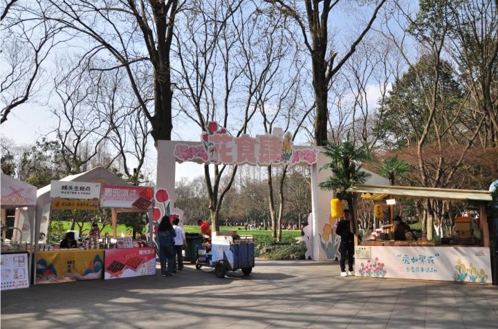 花食肆美食区,位于逍遥坡大草坪的边上,集合了各种美食美饮,充满了人间烟火气。