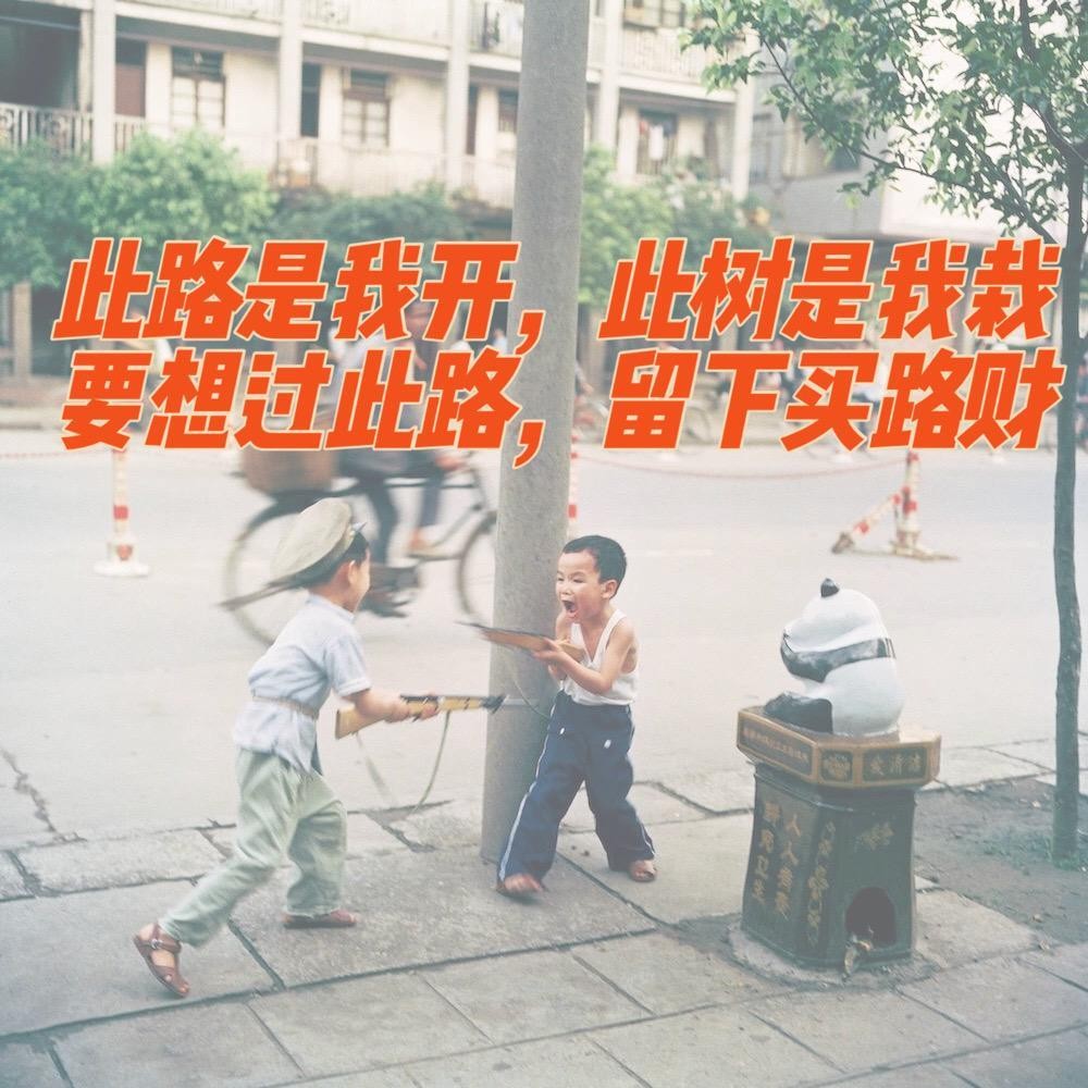 这句顺口溜主要在男孩间广为流传。玩抓人游戏时,逮到一个倒霉鬼,站在路中央,一手叉腰,一手拿着树杈、金箍棒、玩具枪假装土匪“打劫”,两个人借着墙和树开始一场你追我赶,直到跑不动了才休战。谁小时候没有梦想过占山为王,纵情肆意地走江湖呢?
