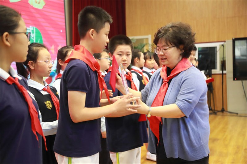 大雁塔小学副校长闫建锋宣读新队员名单,并由老队员为新队员们戴上了鲜艳的红领巾。