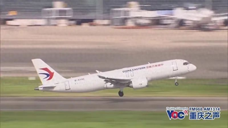 东航C919从上海虹桥机场飞抵重庆江北国际机场,航班号MU5421/5428,上海至重庆08:05-10:55,重庆至上海12:50-14:55。