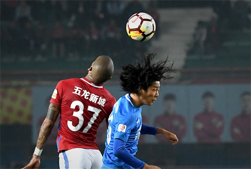 2018年10月21日,河南建业队球员卡兰加(左)在比赛中争顶头球。当日,在2018赛季中超联赛第26轮比赛中,河南建业队主场以2比0战胜广州富力队。新华社记者李安摄