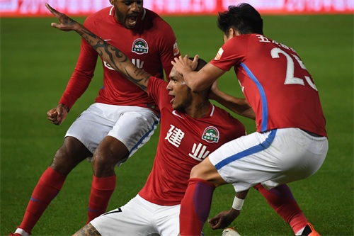 2018年10月21日晚,河南建业队球员卡兰加(中)在2018赛季中超联赛中庆祝进球。新华社记者李安摄