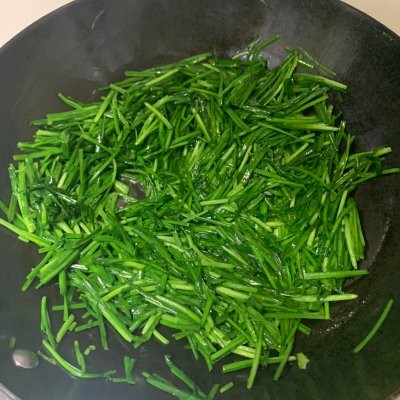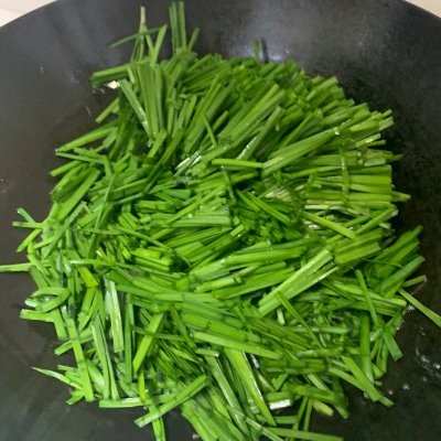 7、炒完毛豆米的锅不用清洗,倒入适量油,油热倒入切好的韭菜翻炒