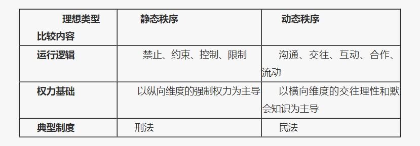 在学理上,所谓的“秩序”,就是“一切事物依照一定的规则或规律呈现出的和谐状态。”在这个意义上,无论是自然界还是人类社会,在日常运行的过程中,通过观察,我们均可以在其中发现某种较为稳定的规律性状态或规则性状态,换言之,一种摆脱了混乱的、不确定的、非连续性状况的和谐状态。不过,与自然界不同,由于社会的基本组成单位是一种具有高度自主意识和自由意志的社会化动物——人,这就决定了,社会秩序的形成与维系不单单要表现出规律性特征,更要在此基础上凝结为一种规则性状态,使得其中的每一位成员都能在规则的指引、协调与庇护下,安全、有预期地与他人产生稳定、反复的交往。进而,通过对于现实世界的经验观察和抽象概括,我们可以将社会秩序大致分成韦伯意义上的两种“理想类型”,这就是“静态秩序”和“动态秩序”。大体上,静态秩序和动态秩序的具体特征可以通过下图简要表示出来: