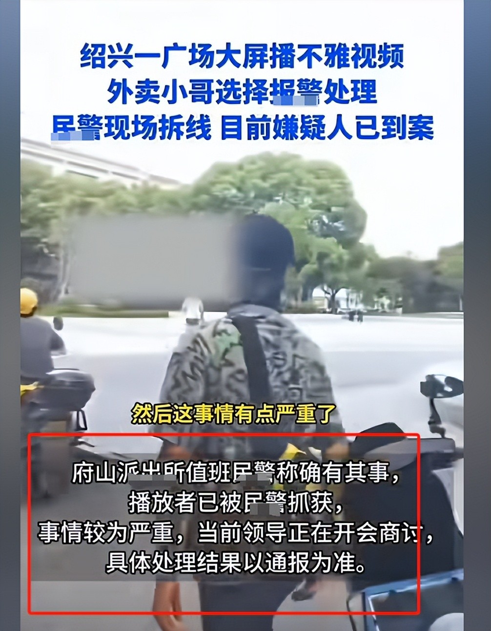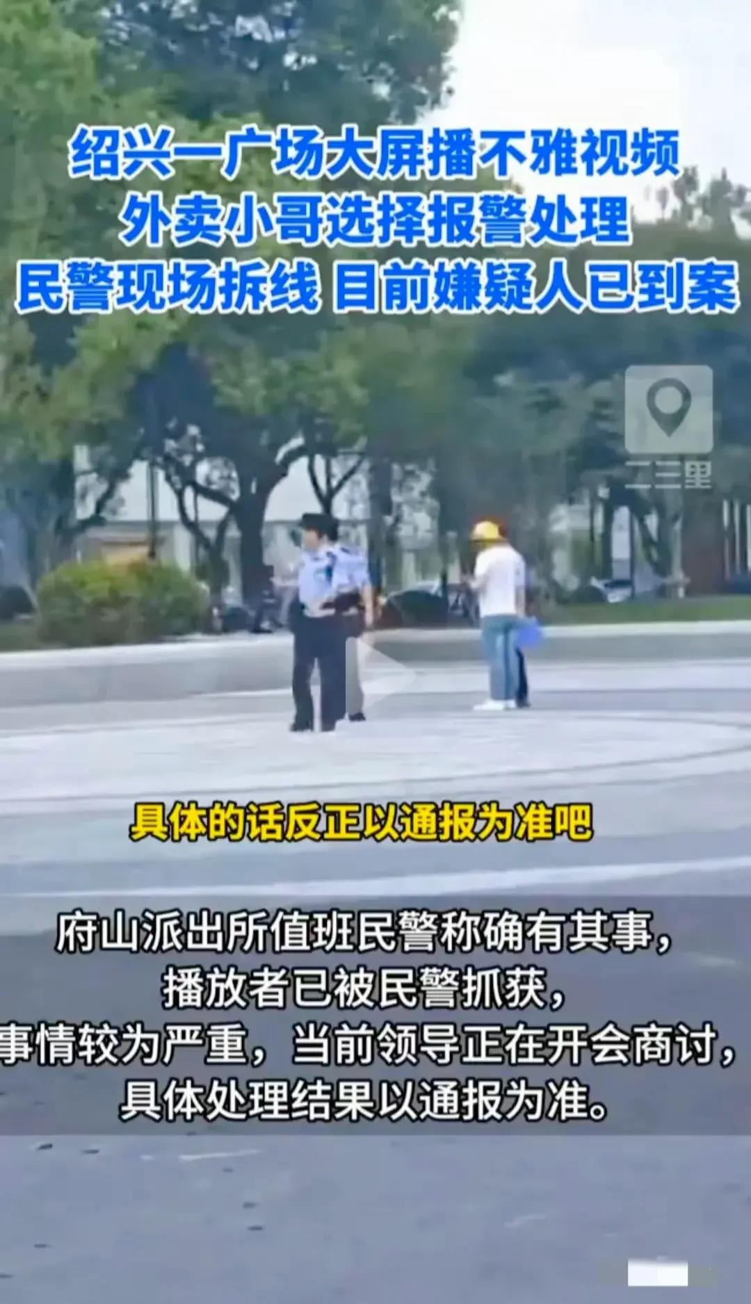 绍兴一广场大屏播不雅视频,外卖小哥选择报警处理,民警现场拆线,目前嫌疑人已到案(二三里资讯)