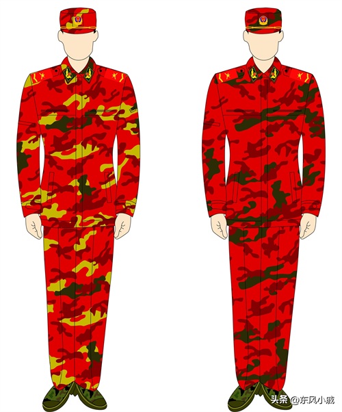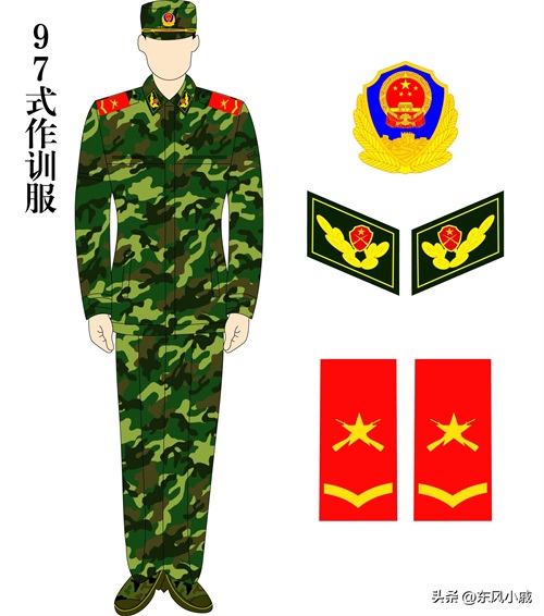 由于装备时间的关系,97式作训服陆陆续续才大规模装备,所以之后都搭配使用的99式警衔;97式迷彩作训服作为制式装备,为绿色的配色,但其他兵种所配备的可谓是五花八门,武警还为森林部队配备了两款红色的迷彩作训服,以至于在森林中易发现和救援