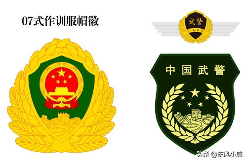 07式武警帽徽,在公安警徽的基础上,更改盾牌底色,增加一圈麦穗环绕,保留了盾牌和长城图案;07式武警胸标则有盾牌、飘带、麦穗等作为主题图案,飘带上方的文字可以标明省份和警种;07式臂章为统一样式,上方为“中国武警”,下面为麦穗包围着的五星和长城