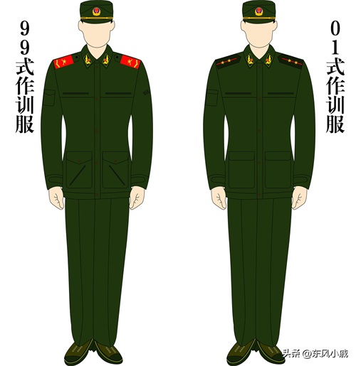 99式和01式都是纯色作训服,99式作训服则是87式迷彩作训服的纯色版本,几乎没有大范围的改动,01式作训服则是取消倒山形口袋和侧边拉链