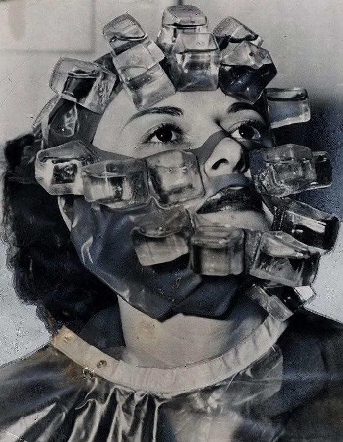 上世纪四十年代的面部美容方法,脸上直接贴冰块,但是的人觉得这样可以消除面部浮肿。