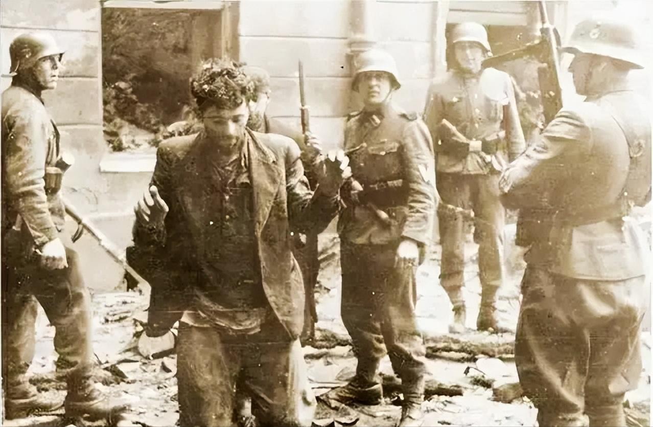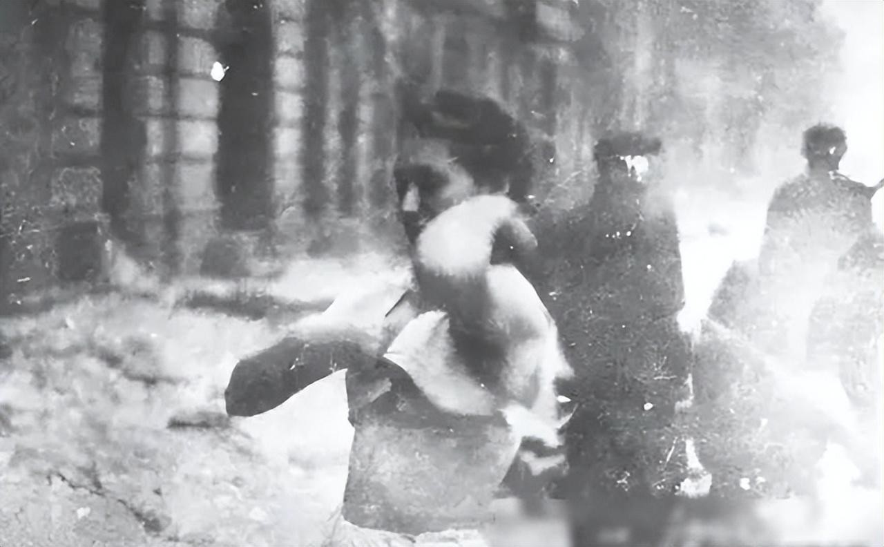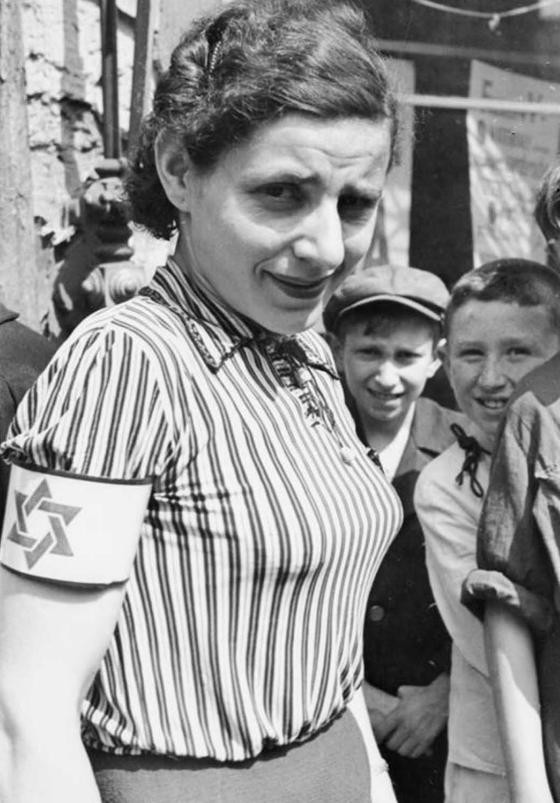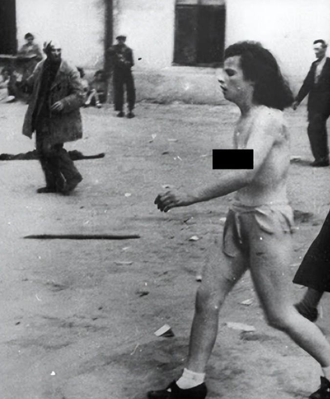 在清理行动中,这些犹太女人不管是在哪里,只要被发现了,就会遭到侮辱和殴打,这个女人被脱掉衣服,走在大街上,边上还有人在远处观看。