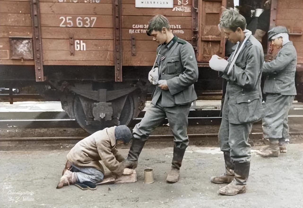 在东线的一个火车站中,一名受伤的德国士兵正在让一名苏联儿童给他擦靴子