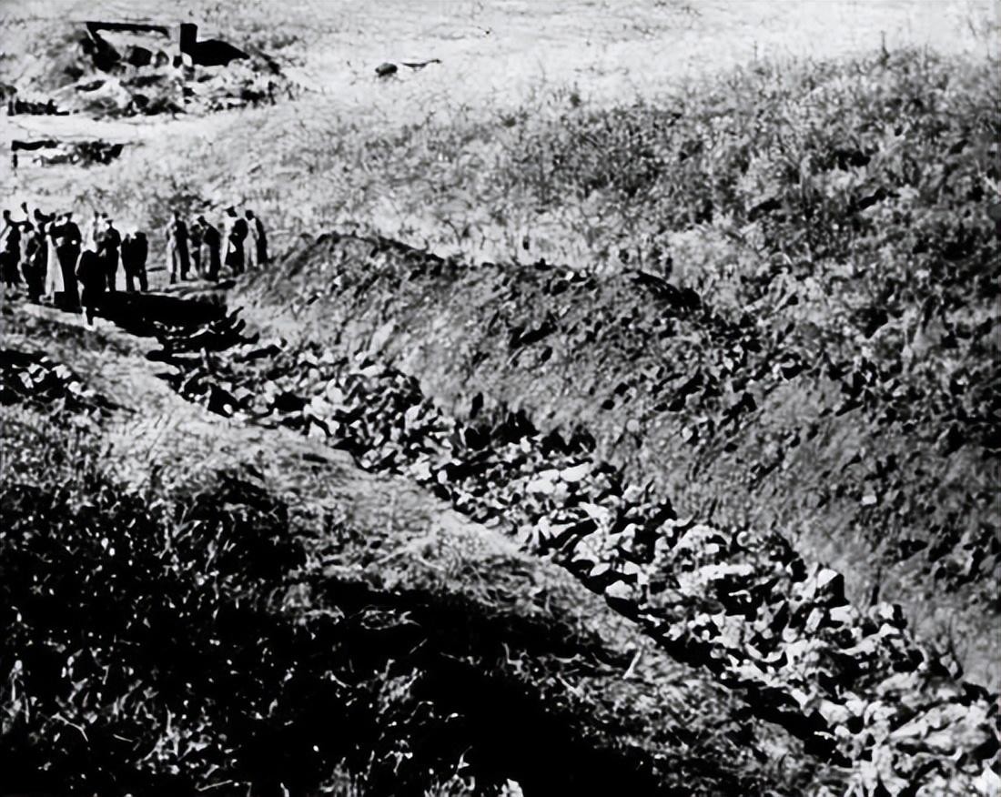 拍摄于1944年,苏联调查人员在娘子谷的墓坑旁。