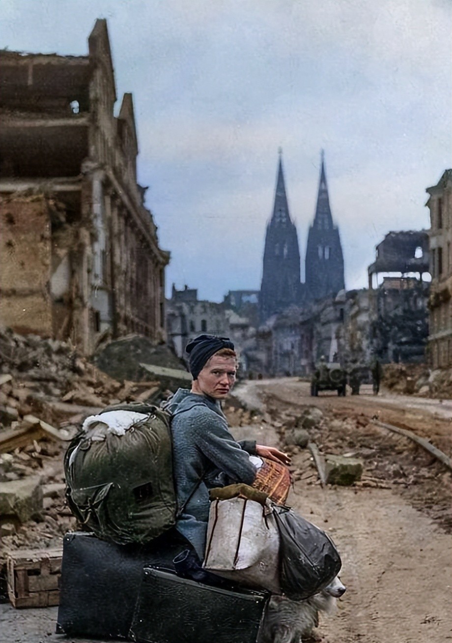 二战结束后,一位德国妇女坐在德国克隆的废墟前发呆。