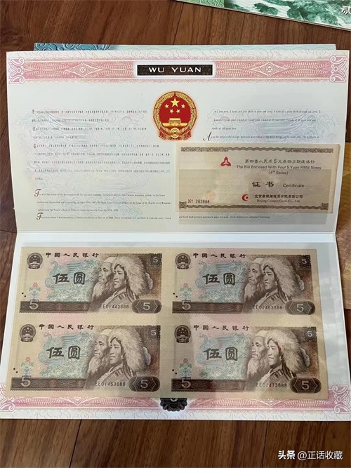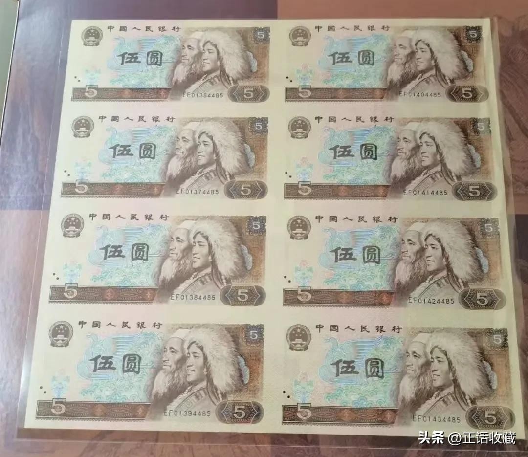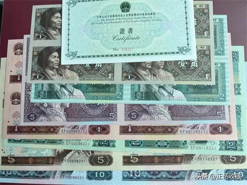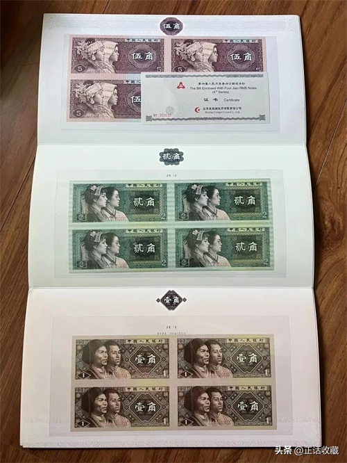 虽然一角和五角仍在流通使用中,但并不影响它们的四连体正常交易,这套角币的价格也相对比较稳定,由于面值较低,所以溢价不高,而且市场交易量不大,很多人觉得花一千多购买几张角币不值,所以这是四版币连体钞中较为冷门的币种。