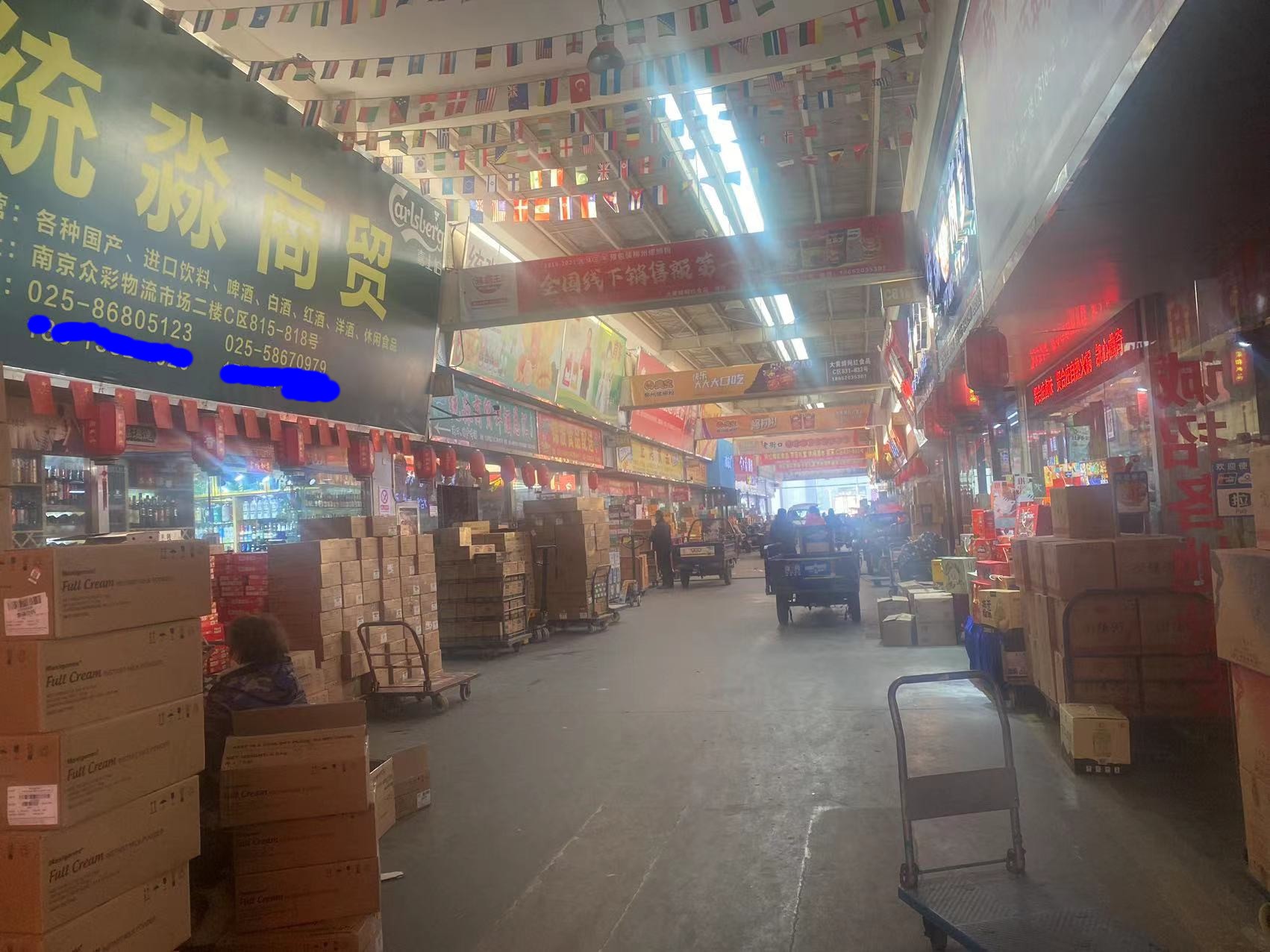酒水饮料区,在水产区楼上,属C区,商品大多属于商超渠道 ,白酒,啤酒,红酒,洋酒,各种常规饮料以及进口酒水。