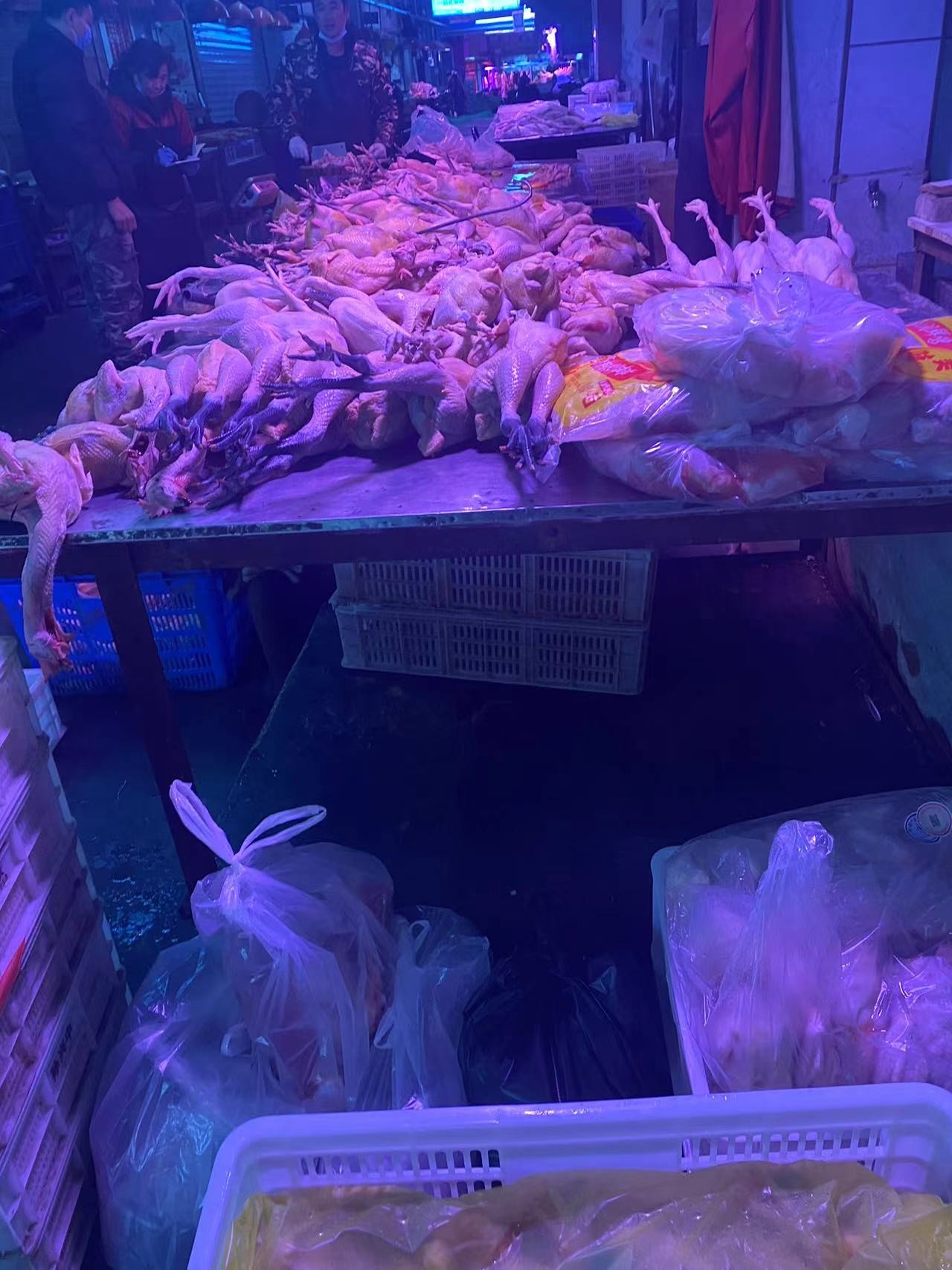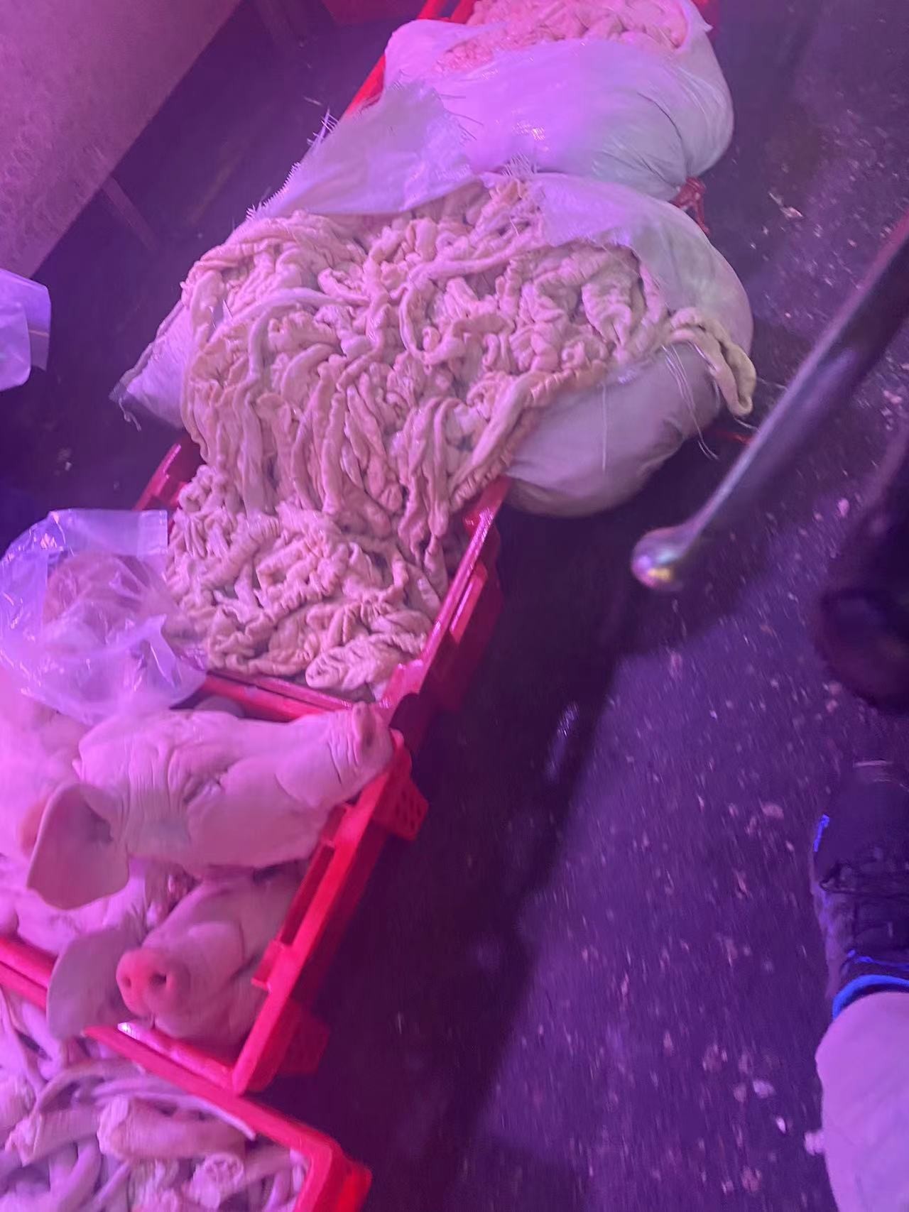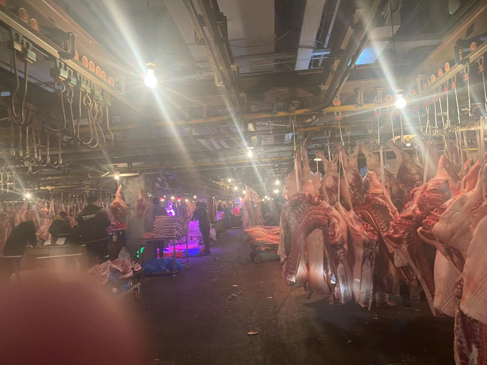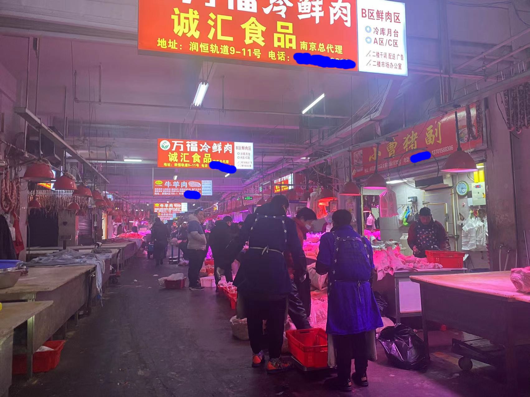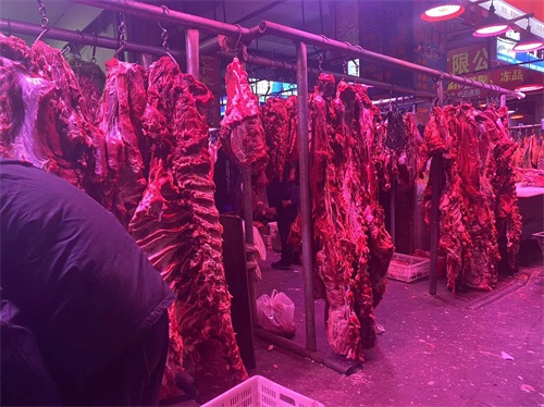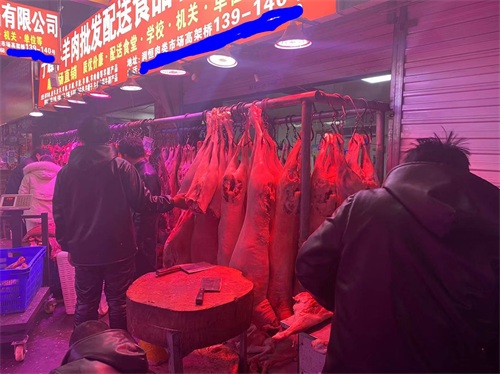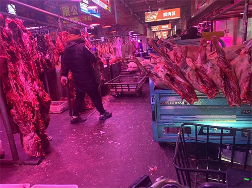 鲜肉交易区,设在润恒市场内,进门即可看到,商户每天凌晨2.3点就开始分货,分割,整理肉品,常见种类猪牛羊,鸡鸭鹅,等等