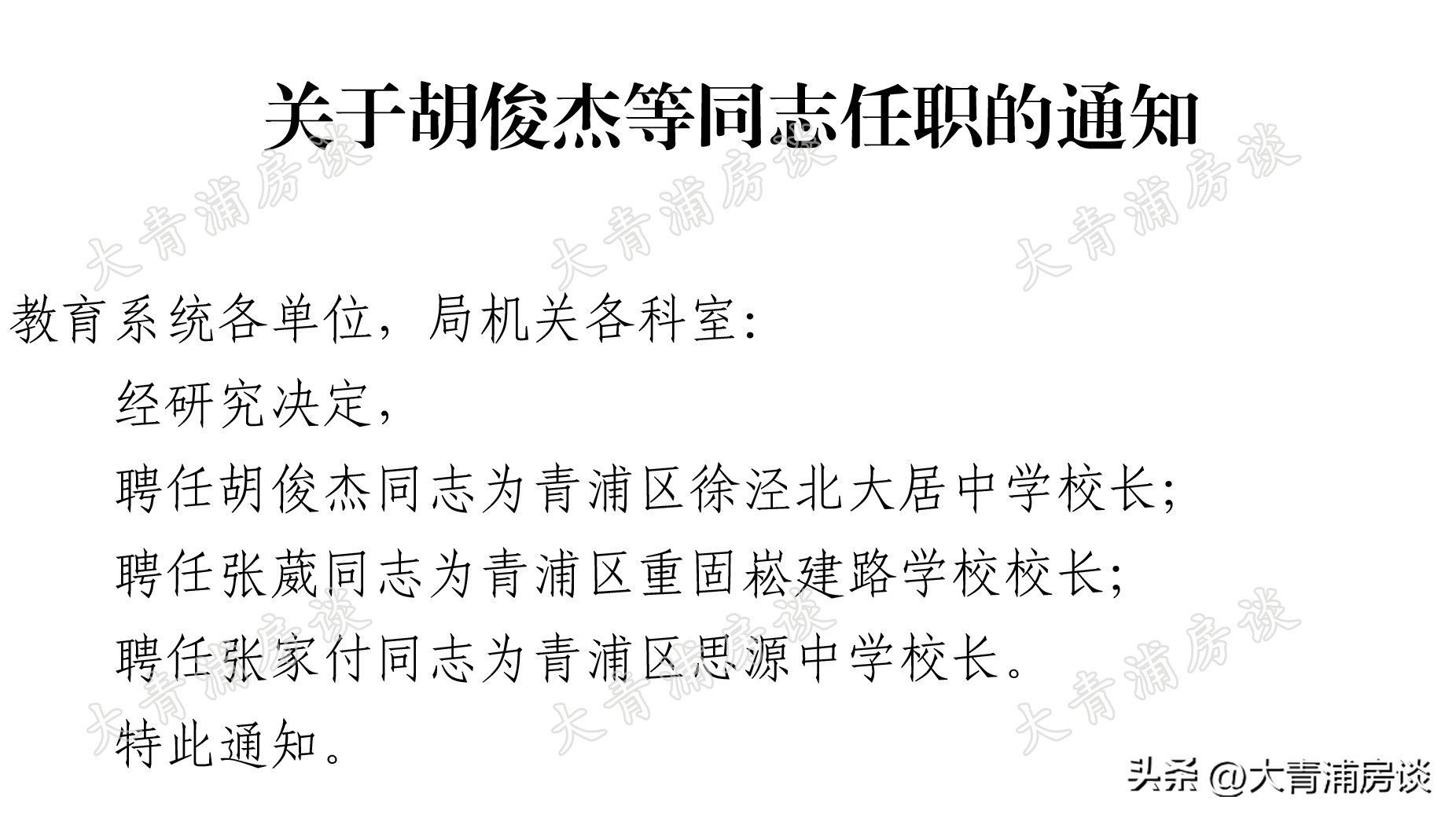 聘任胡俊杰同志为青浦区徐泾北大居中学校长;