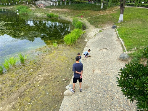 儿子在湖边寻找龙虾