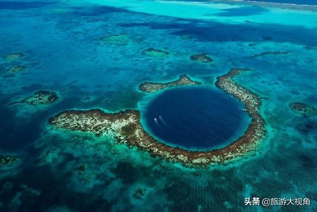 详细介绍:大伯利兹蓝洞是一个水下洞穴,深123米,洞口直径为305米,景色非常的壮观,许多潜水爱好者会慕名来到这里,从远处看仿佛是一个深蓝色的花环。