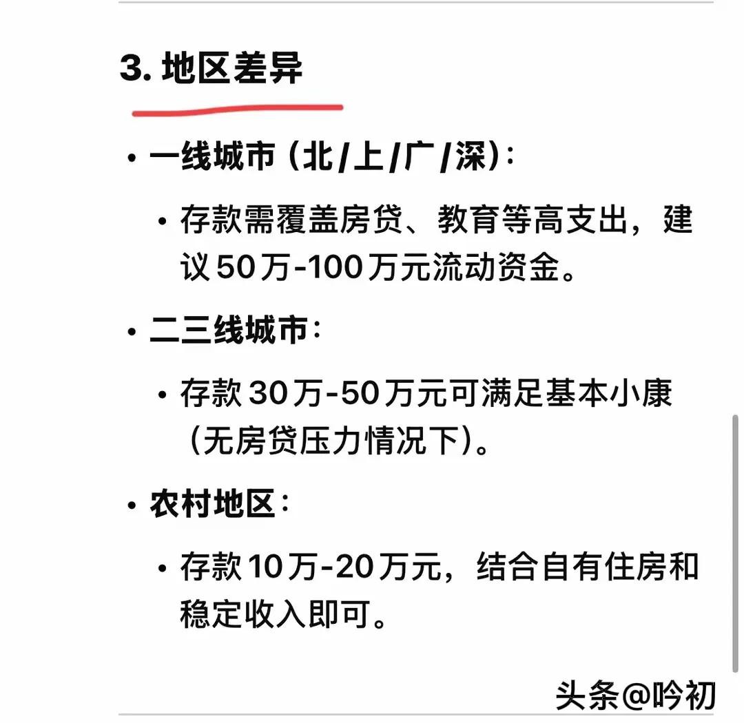 不同地区的小康家庭存款标准也应该有所区分。