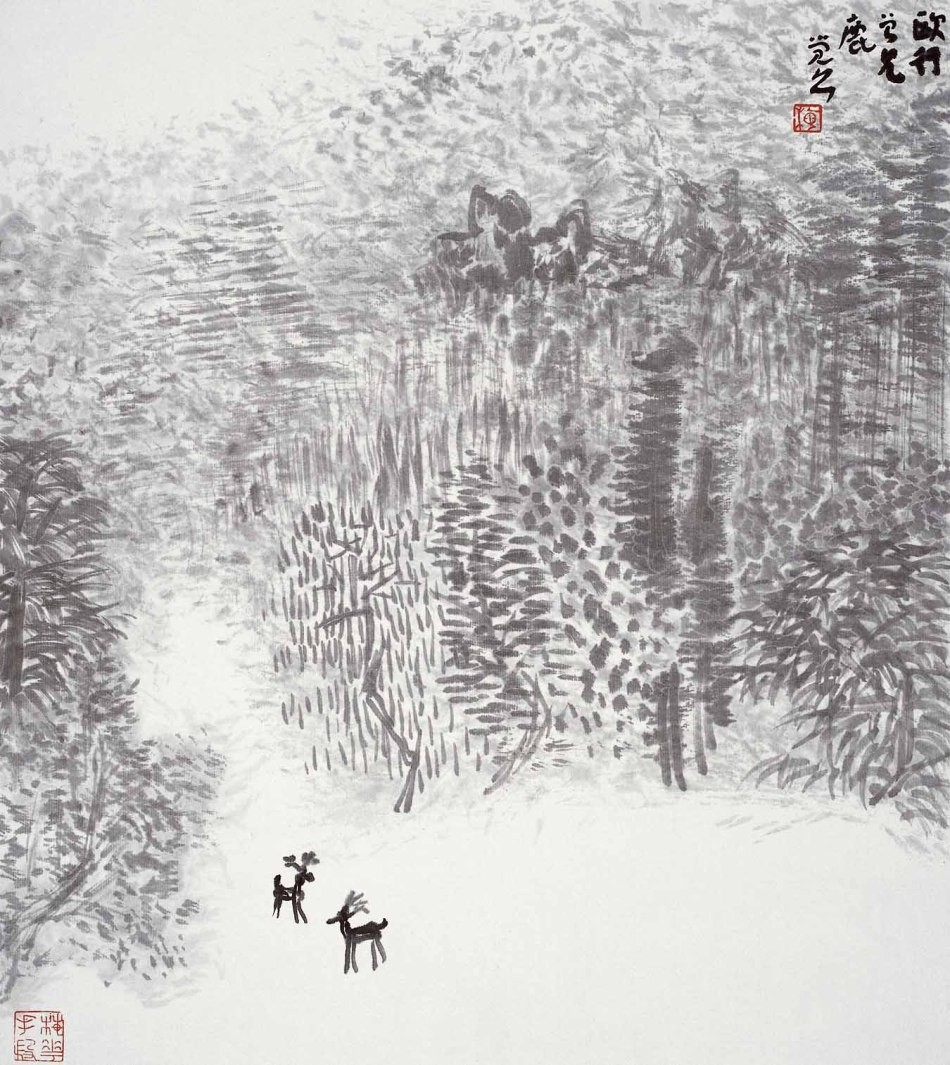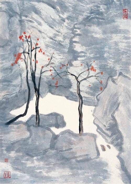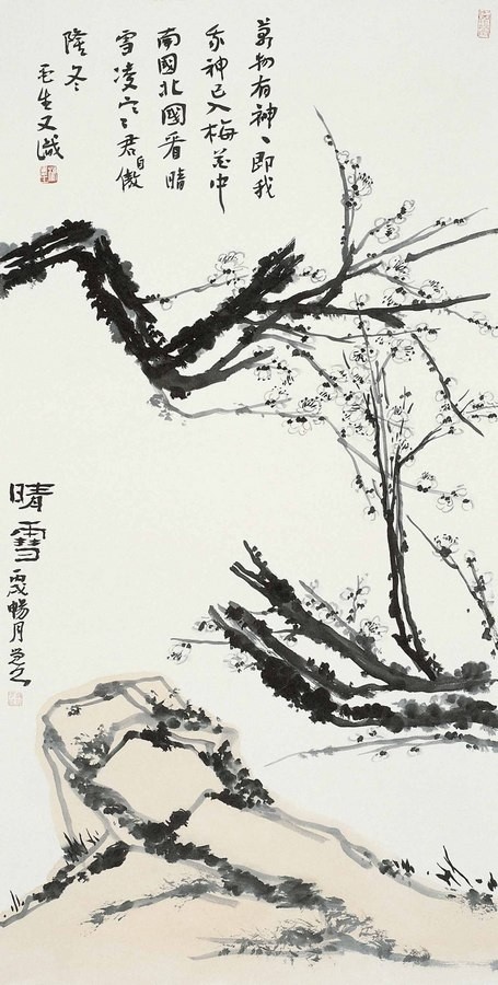 梅墨生是一位从事中国画、书法艺术创作和近现代艺术研究与评论的“三栖型”人物。童中熹先生评价说:墨生擅山水、花鸟。所作静、雅、遒、空灵,而大都出之以“拙”,以其书、画同法故也。其法,山水盖得力于八大、石溪、龚贤、渐江,近师黄宾虹、李可染;花鸟则综合八大、缶翁、齐白石、潘天寿、李苦禅诸大家。然章法、结体,虚虚实实,不同凡响。《二楞图》、《青山雨霁图》之幻化,《依样》之韵律,《秋山图团扇》及《山深有古寺》繁而不实,《深山云烟平》满不迫塞,《夏山图》之苍茫清空,《云山几重》之推宕,或经意,或“不经意”,皆别出心裁,非揣摩有得者不能为。墨生的画,属传统文人画。