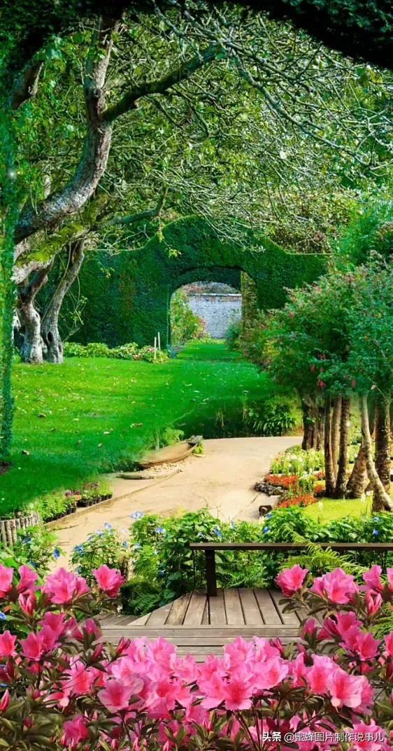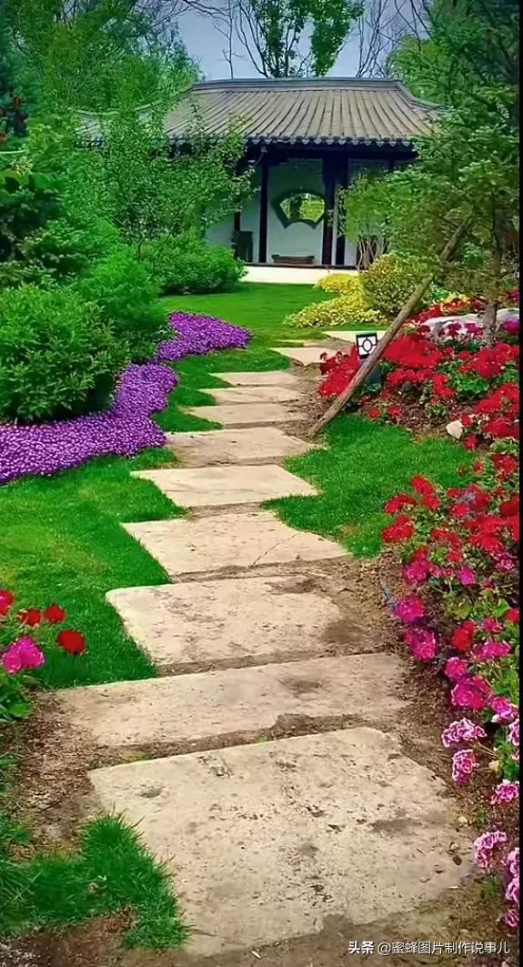 花园中,错落有致的小路,两边都是鲜花盛开,有红的,紫的,绿色的草地好美啊!