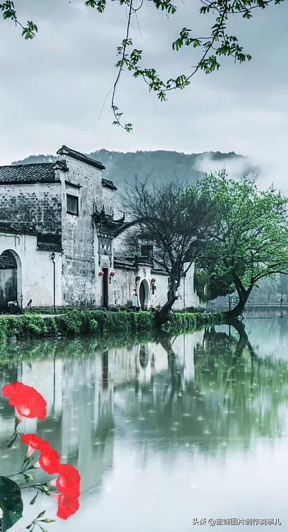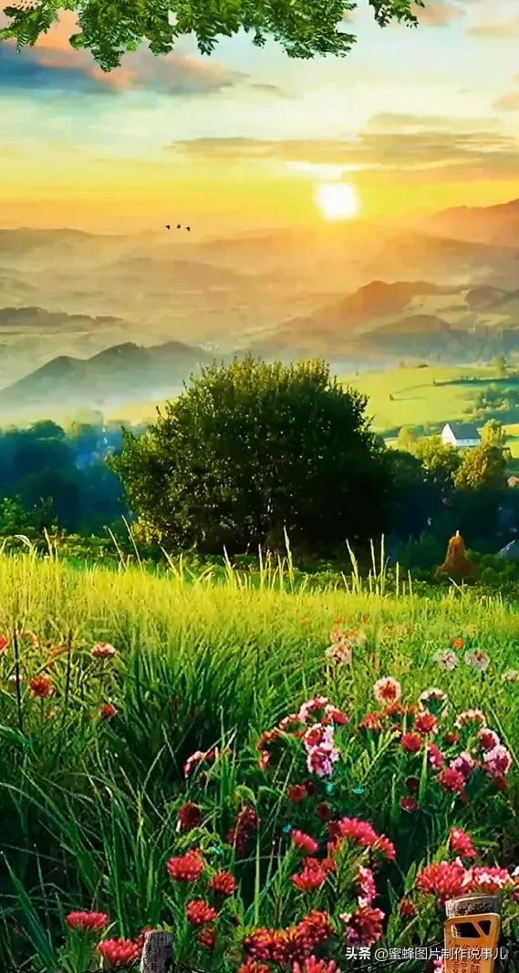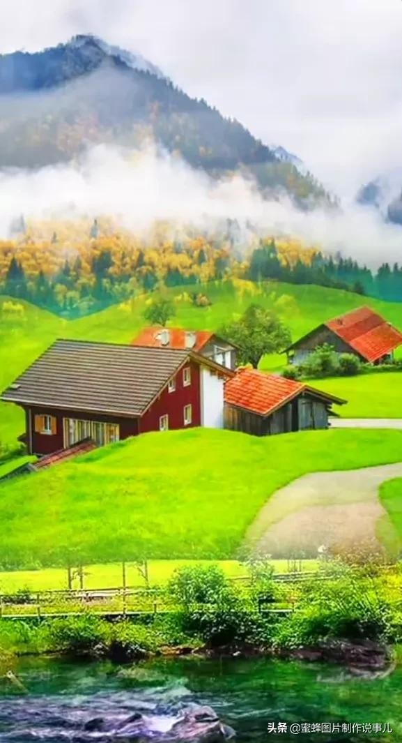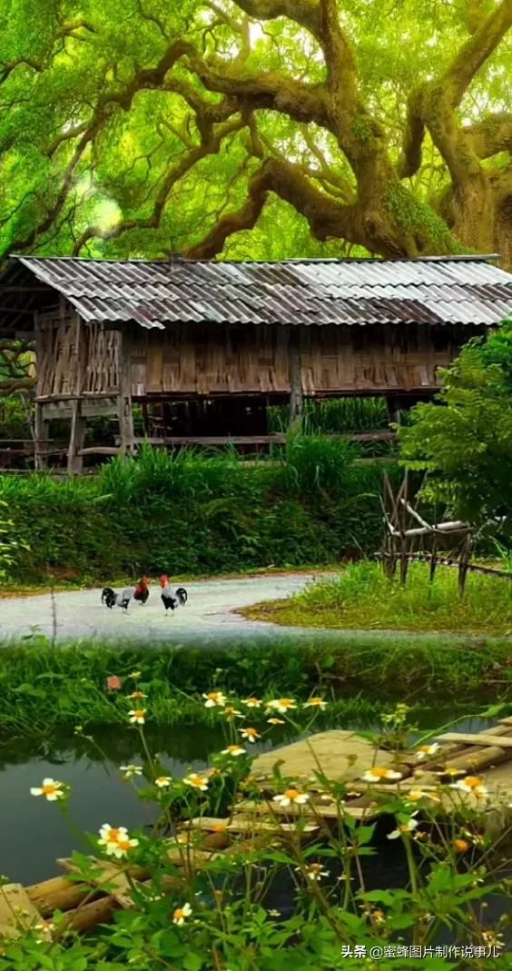 百年老树下,一座木屋,房前的小路上,两只公鸡鸣叫着,叫醒了大地万物,路边的小溪边长满了不知名的小花,山村美景如画。