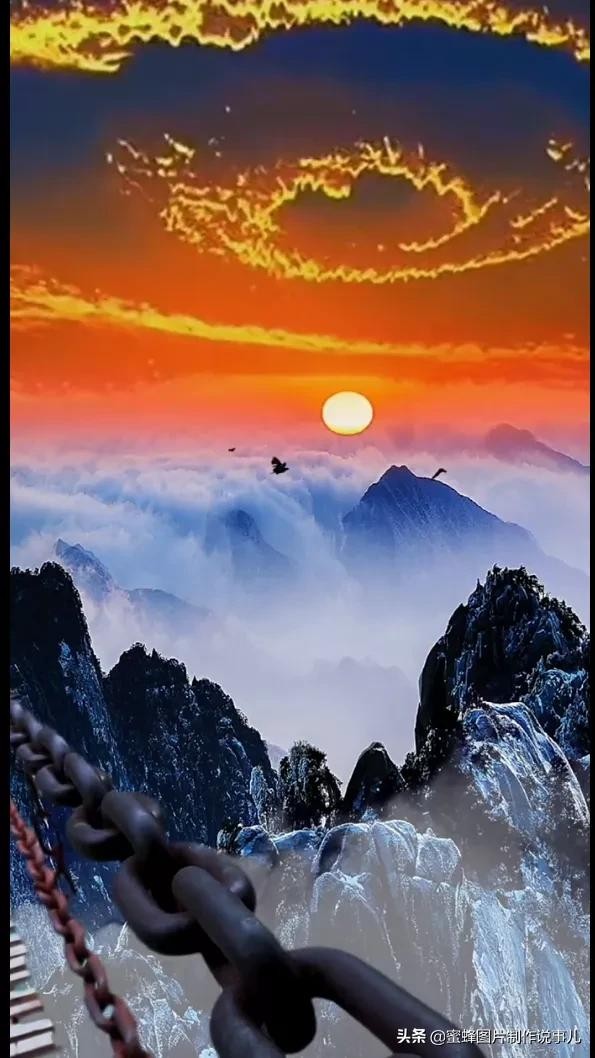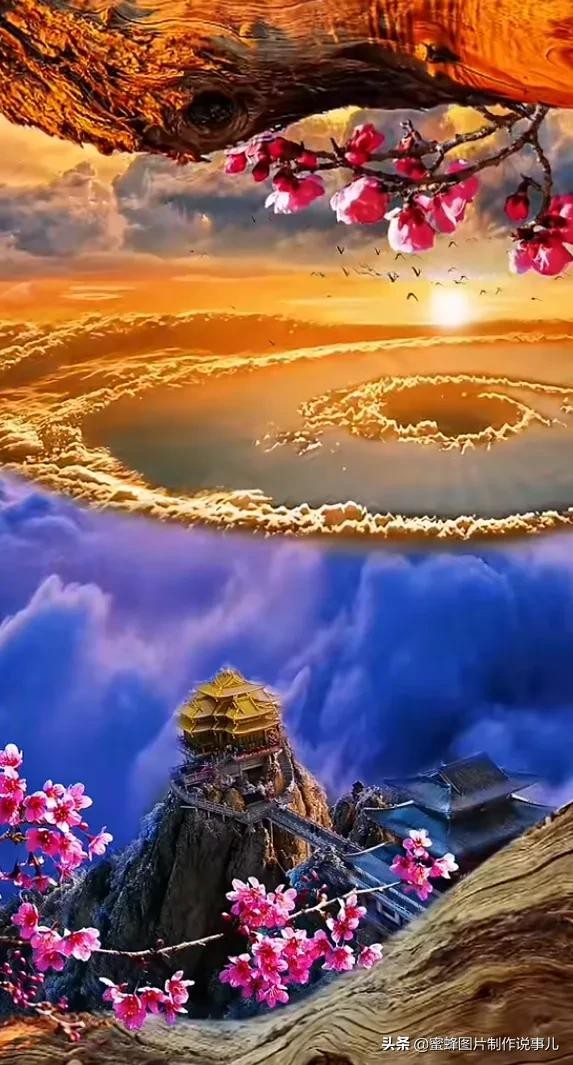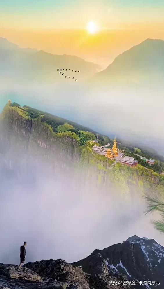 早晨冉冉升起的金色太阳,照射着云层,把云也染成了金色,照的上山的建筑物金碧辉煌。