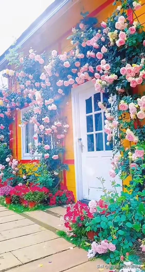 房屋门前爬满了盛开的蔷薇,如画一样漂亮。