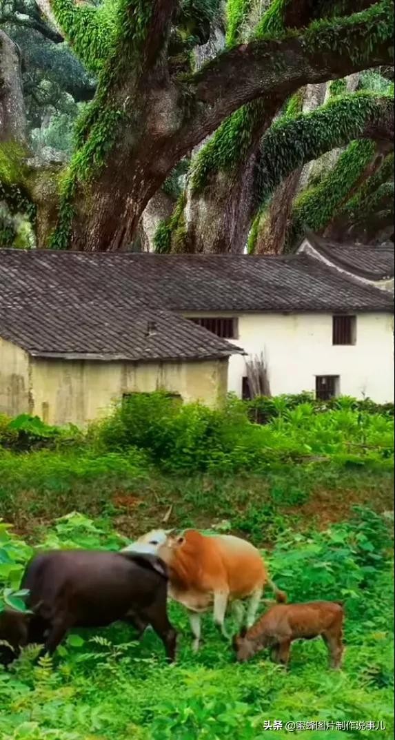 老牛,屋子,好一副画面,屋子后面的草地里。三只牛儿在吃草。