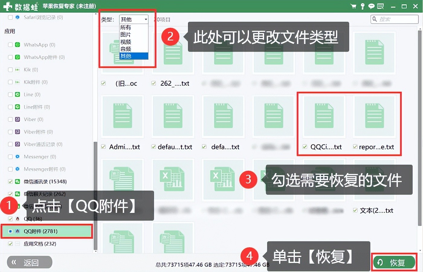 步骤5:扫描完成后,可以看到左侧的目录中列出了所有数据类型。找到【QQ附件】选项,然后选择需要恢复的文件,最后点击右下角的【恢复】按钮即可将文件保存到电脑上。