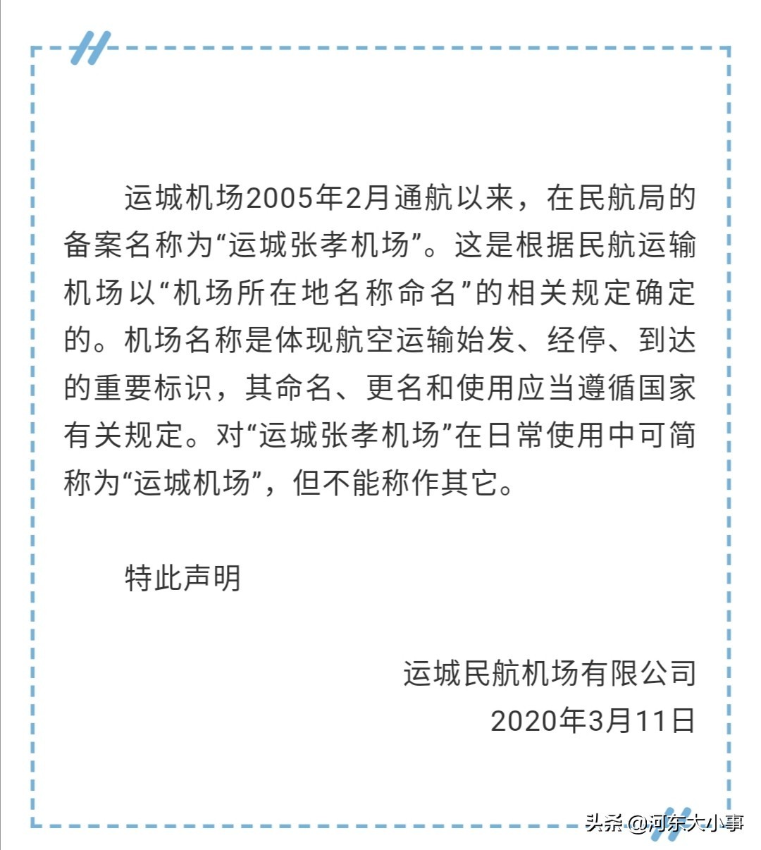 而今天运城机场就发布了一则声明:运城机场自2005年2月通航以来,在民航局的备案名称为“运城张孝机场”可简称为“运城机场”,但不能称作其它!所以,以后请叫我“运城张孝机场”。
