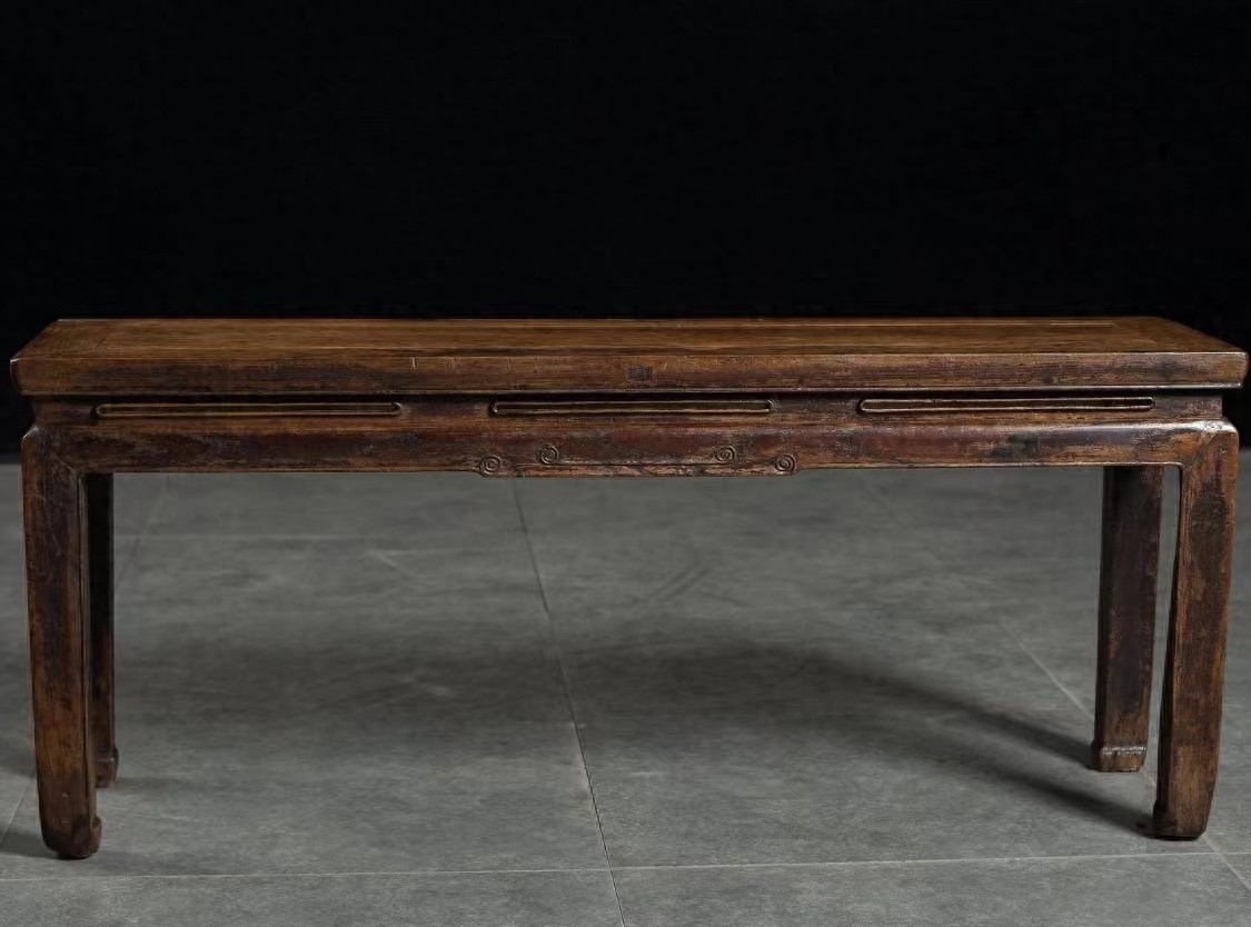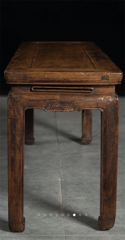 从图片上看,这是一条清代实木束腰春凳,这个名字有点让人浮想联翩,春凳是可供两人坐用的一种凳子,古时民间用来作为出嫁女儿时,上置被褥,贴喜花,请人抬着送进夫家的嫁妆家具。