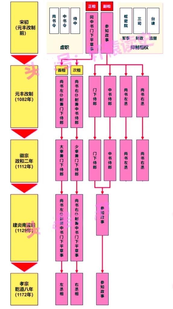 宋朝的官员组成复杂,分别由差遣,本官阶,散官阶,勋官,爵位,贴职等组成。宋太祖建立宋朝后,对中央官制作进行调整。中枢官制是中央集权轴心,特点是用设官分职,分割各级长官事权办法来削弱其权力。宋代设立中书,枢密与三司分掌政、军、财三大务,宰相之权为枢密使,而握有最高行政权者统称宰执。宋制定出一整套集中政权,兵权,财权,司法权等各种制度,专制主义中央集权加强是从宋代逐步发展。
