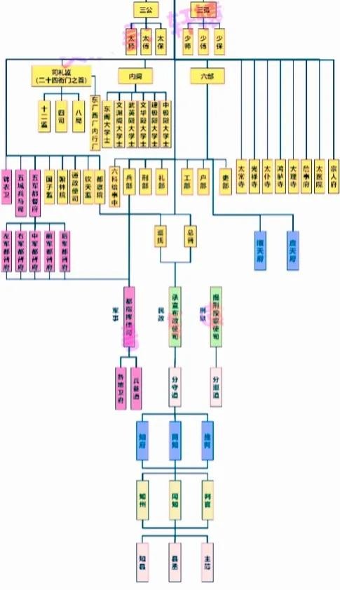 明清时期非常重视官员品级,当时官员分为九品,明朝制度承袭元朝官职因素,另外从汉族旧制中采取大量制度,形成明朝官僚制度。太祖废除丞相,升六部,后有内阁以为资政之用,改御史台为都察院。废中军都督府,分为五军都督府,分掌兵权,重用大理寺,与刑部,都察院并称三法司,成为中央最高司法机关。明朝废行省,原各省治所设三司,派出总督,巡抚到各地巡查,并非三司上级。清代设有河道总督等专职总督,总督和巡抚都是中央官,一般在都察院有官职。