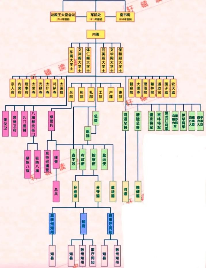 清朝中央官职分中枢部,佐理部和帝室部三类。其中,中枢部包括内阁, 军机处和六部官员。佐理部包括:都察院,大理寺, 理藩院,翰林院,通政司,国子监,钦天监。帝室部包括宗人府, 内务府,詹事府,太常寺,光禄寺,太仆寺,鸿胪寺和太医院。清朝地方官职分文官和武官,例如总督,巡抚,将军,提督等。清朝沿袭明朝传统,清初官制承明旧制,对明朝官制中突出弊端稍加厘革。直到乾隆时期逐步调整,从而稳定下来。