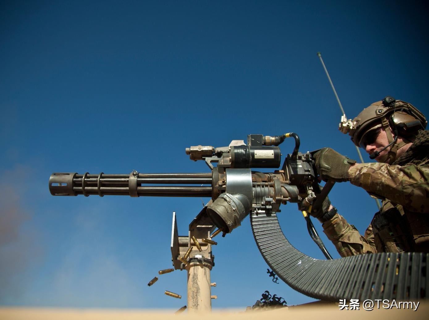 同样是在六十年代,又在M61加特林机炮的基础上,改进出了口径为7.62毫米的加特林M134速射机枪,发射7.62x51毫米NATO步枪弹药,使用弹链供弹,每分钟理论射速可达到惊人的6000发,有效射程800~1000米。