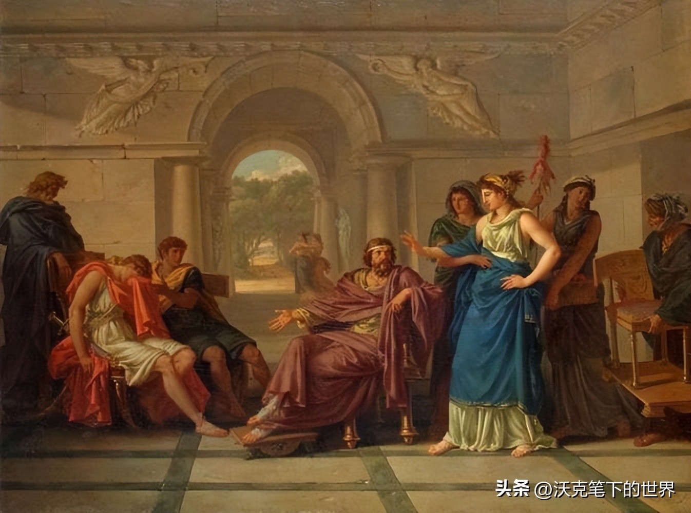 “她甚至恨起他的儿子来了,一看见他们,就不高兴;我害怕她设下什么新的计策,——我知道她的性情很凶猛,她不会这样驯服地受人虐待!——我害怕她用锋利的剑刺进她两个儿子的心里,或是悄悄走进那铺陈着新床的寝室中,杀掉公主和新郎”。